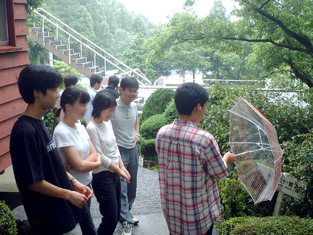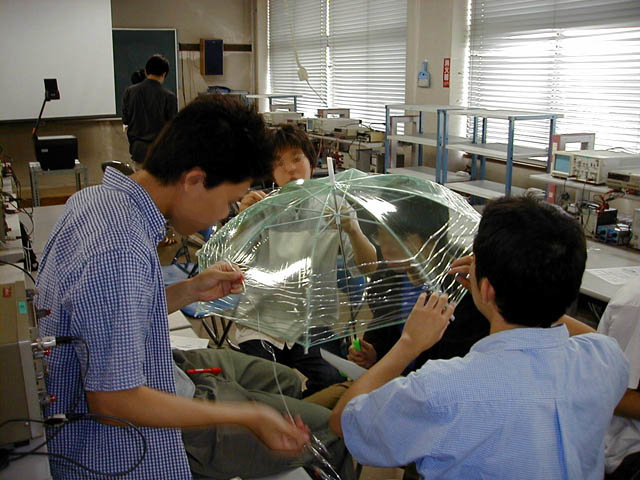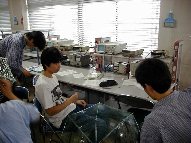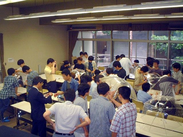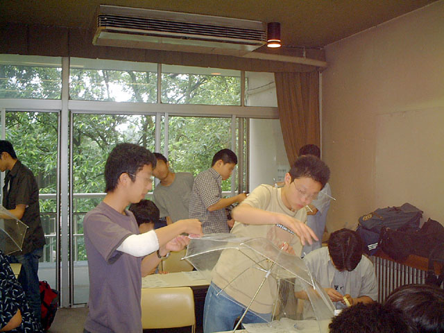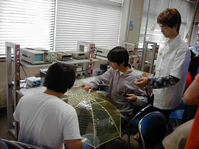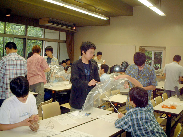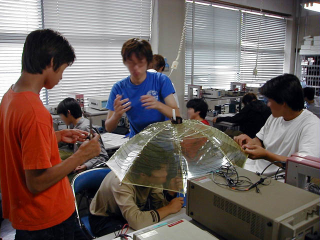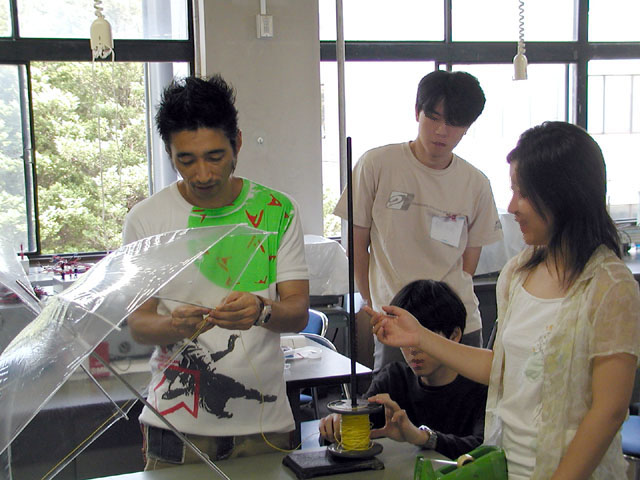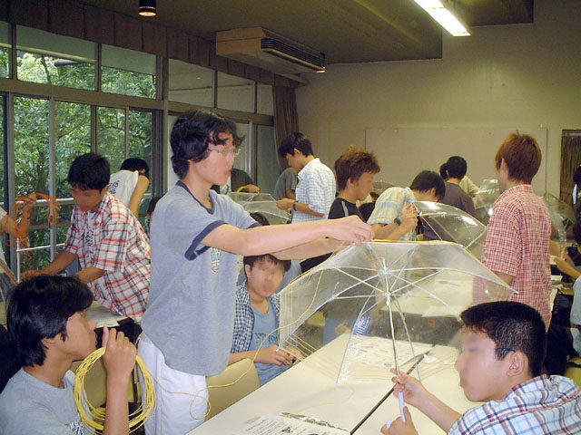2003年7月6日の総合工学基礎Tの様子です。この年は傘ラジオ製作の回を、1年の合宿研修の二日目に移して行いました。